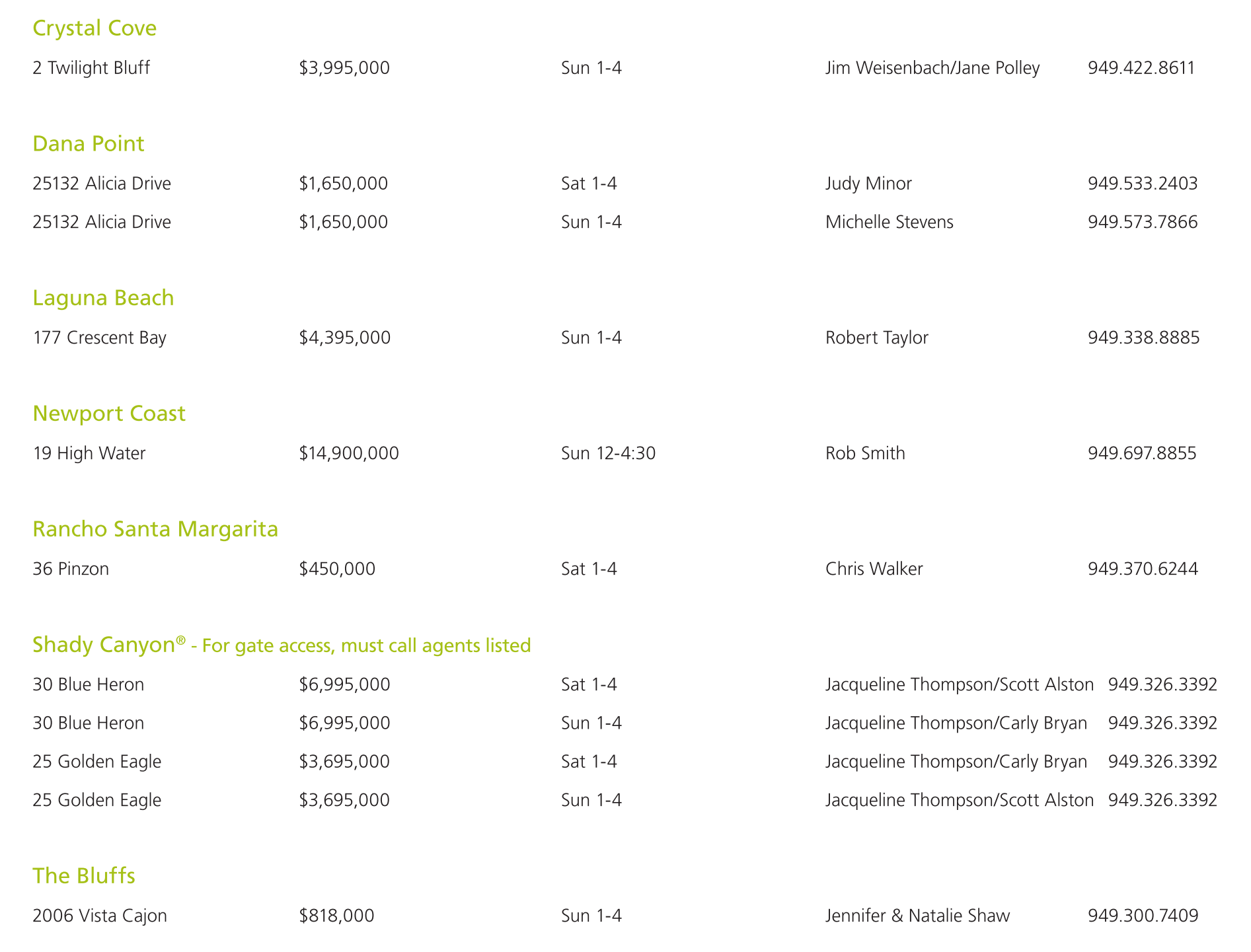 30 Blue Heron $6,995,000 Sun 1-4 Jacqueline Thompson/Carly Bryan 949.326.3392