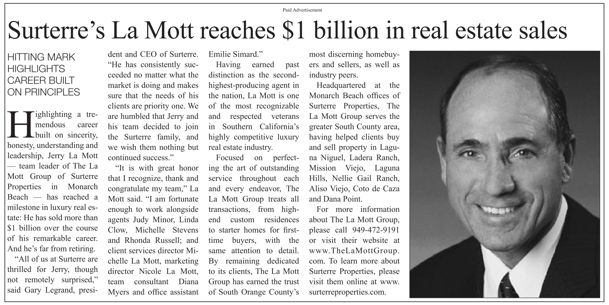 a tremendous career built on sincerity, honesty, understanding and leadership, Jerry La Mott — team leader of The La Mott Group of Surterre Properties in Monarch Beach — has reached a milestone in luxury real estate: He has sold more than $1 billion over the course of his remarkable career. And he’s far from retiring.