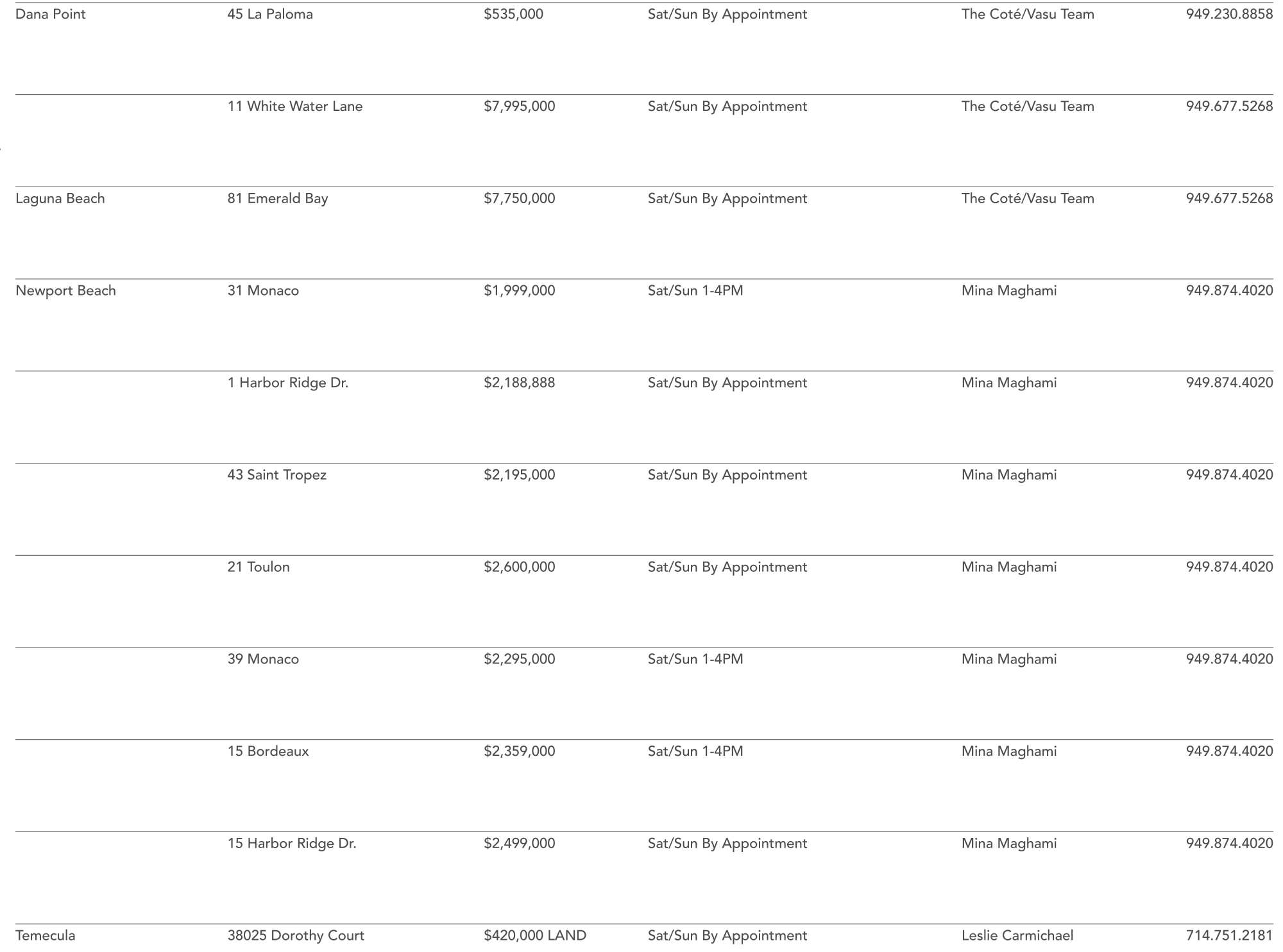 21 Toulon $2,600,000 Sat/Sun By Appointment Mina Maghami 949.874.4020