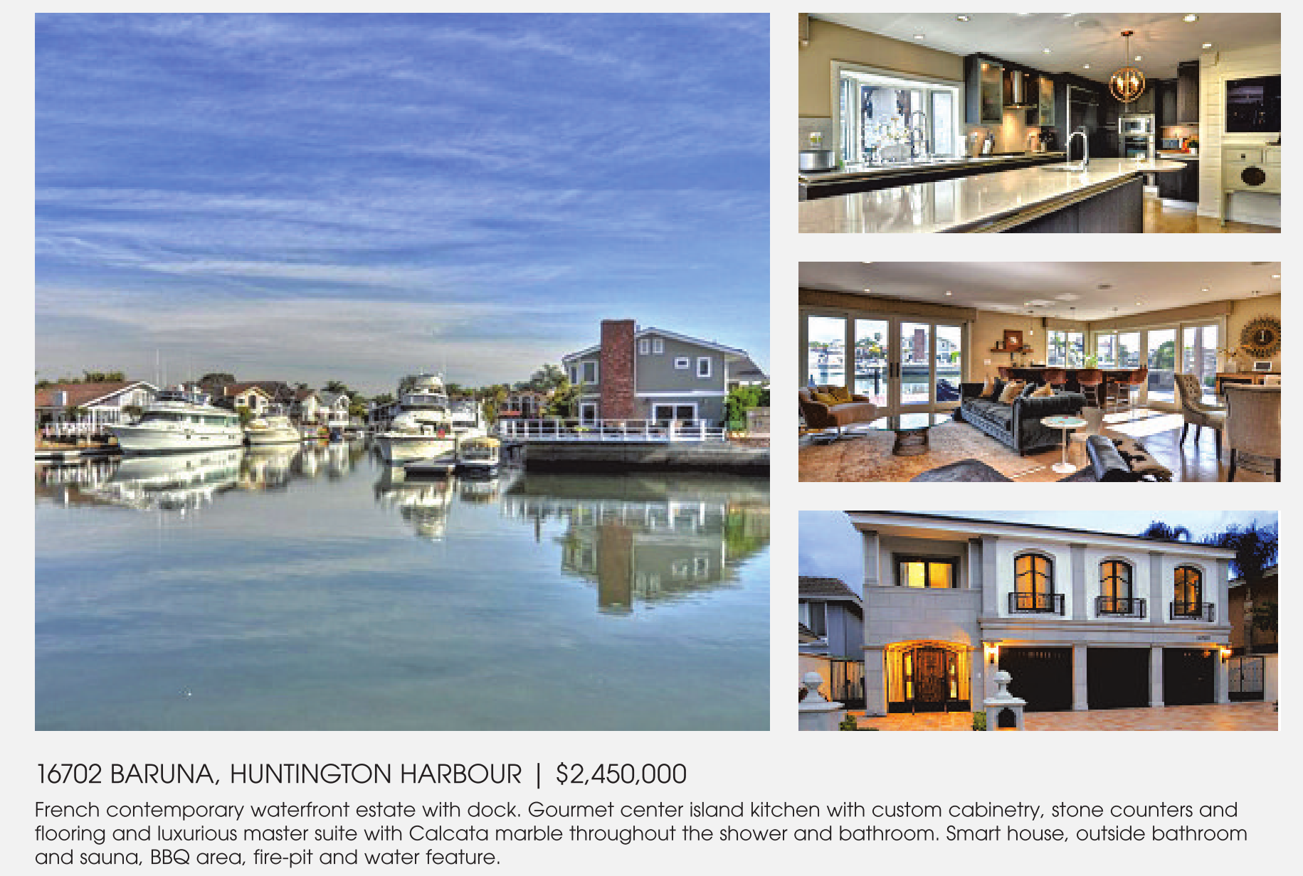 16702 BARUNA, HUNTINGTON HARBOUR | $2,450,000 French contemporary waterfront estate with dock. Gourmet center island kitchen with custom cabinetry, stone counters and flooring and luxurious master suite with Calcata marble throughout the shower and bathroom. Smart house, outside bathroom and sauna, BBQ area, fire-pit and water feature.
