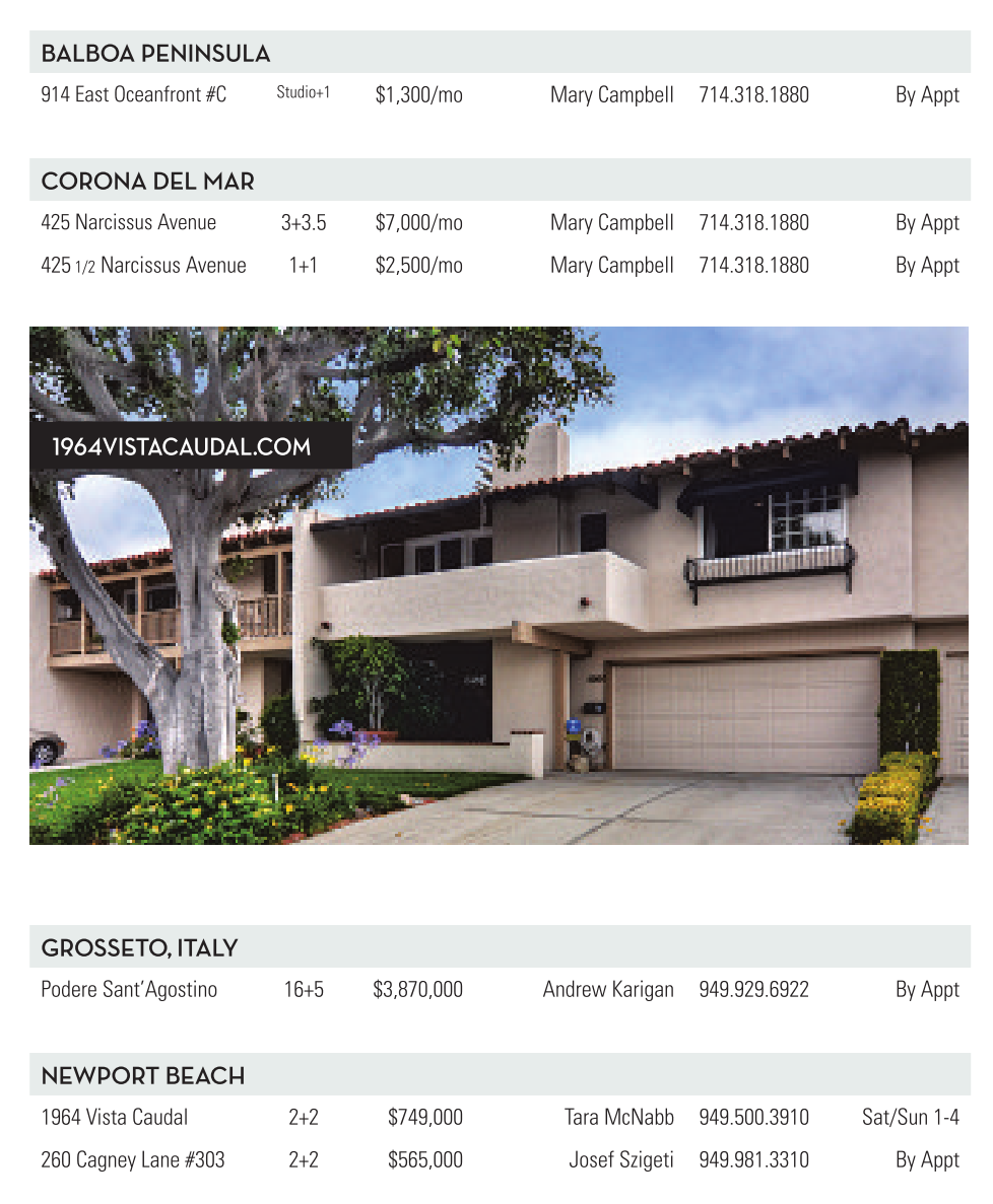 Corona Del Mar 425 Narcissus Avenue 3+3.5 $7,000/mo Mary Campbell 714.318.1880 By Appt 425 1/2 Narcissus Avenue 1+1 $2,500/mo Mary Campbell 714.318.1880 By Appt