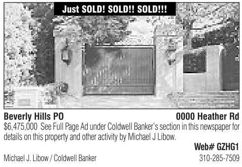 Just SOLD! SOLD!! SOLD!!! Beverly Hills PO 0000 Heather Rd $6,475,000 See Full Page Ad under Coldwell Banker’s section in this newspaper for details on this property and other activity by Michael JLibow. Web# GZHG1 Michael J. Libow /Coldwell Banker 310-285-7509 See also