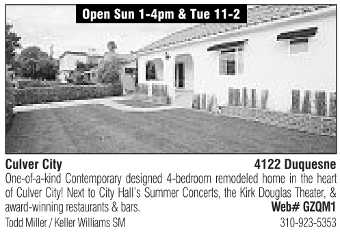 Culver City 4122 Duquesne One-of-a-kind Contemporary designed 4-bedroom remodeled home in the heart of Culver City! Next to City Hall’s Summer Concerts, the Kirk Douglas Theater, & award-winning restaurants &bars. Web# GZQM1 Todd Miller /Keller Williams SM 310-923-5353