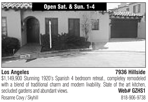 LosAngeles 7936 Hillside $1,149,900 Stunning 1920’s Spanish 4 bedroom retreat., completey remodeled with a blend of traditional charm and modern livability. State of the art kitchen, secluded gardens and abundant views. Web# GZHS1 Rosanne Covy /Skyhill 818-906-9738