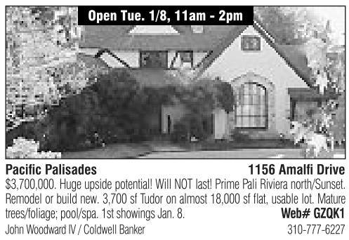 Open Tue. 1/8, 11am -2pm Pacific Palisades 1156 Amalfi Drive $3,700,000. Huge upside potential! Will NOT last! Prime Pali Riviera north/Sunset. Remodel or build new. 3,700 sf Tudor on almost 18,000 sf flat, usable lot. Mature trees/foliage; pool/spa. 1st showings Jan. 8. Web# GZQK1 John WoodwardIV/Coldwell Banker 310-777-6227