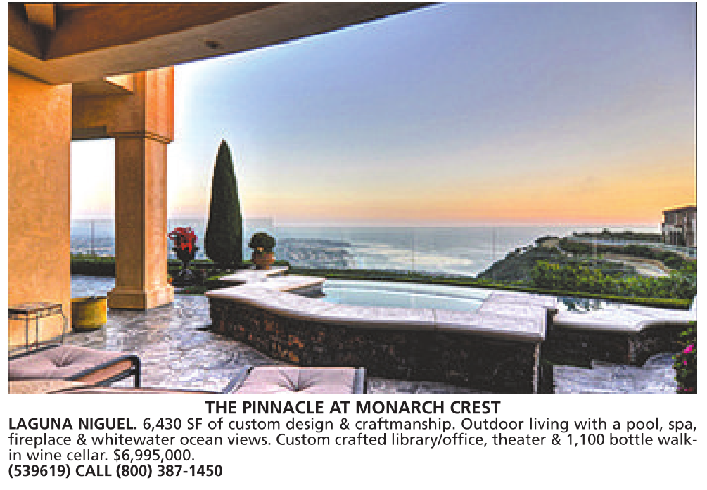 THE PINNACLE AT MONARCH CREST LAGUNA NIGUEL. 6,430 SF of custom design & craftmanship. Outdoor living with a pool, spa, fireplace & whitewater ocean views. Custom crafted library/office, theater & 1,100 bottle walkin wine cellar. $6,995,000. (539619) CALL (800) 387-1450