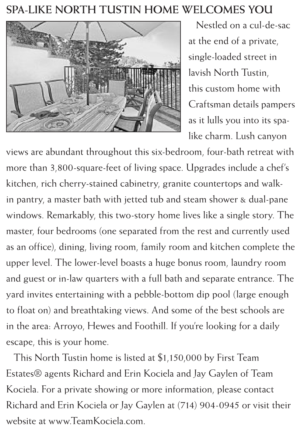 SPA-LIKE NORTH TUSTIN HOME WELCOMES YOU Nestled on a cul-de-sac at the end of a private, single-loaded street in lavish North Tustin, this custom home with Craftsman details pampers as it lulls you into its spalike charm. Lush canyon views are abundant throughout this six-bedroom, four-bath retreat with more than 3,800-square-feet of living space. Upgrades include a chef’s kitchen, rich cherry-stained cabinetry, granite countertops and walkin pantry, a master bath with jetted tub and steam shower & dual-pane windows. Remarkably, this two-story home lives like a single story. The master, four bedrooms (one separated from the rest and currently used as an office), dining, living room, family room and kitchen complete the upper level. The lower-level boasts a huge bonus room, laundry room and guest or in-law quarters with a full bath and separate entrance. The yard invites entertaining with a pebble-bottom dip pool (large enough to float on) and breathtaking views. And some of the best schools are in the area: Arroyo, Hewes and Foothill. If you’re looking for a daily escape, this is your home. This North Tustin home is listed at $1,150,000 by First Team Estates® agents Richard and Erin Kociela and Jay Gaylen of Team Kociela. For a private showing or more information, please contact Richard and Erin Kociela or Jay Gaylen at (714) 904-0945 or visit their website at www.TeamKociela.com.
