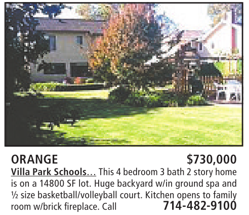 ORANGE $730,000 Villa Park Schools…This 4bedroom 3bath2story home is on a14800 SF lot. Huge backyard w/in ground spa and ½size basketball/volleyball court. Kitchen opens to family room w/brick fireplace.Call 714-482-9100