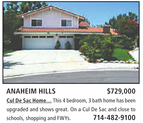 ANAHEIM HILLS $729,000 CulDeSac Home… This 4bedroom,3bathhome hasbeen upgraded and shows great. OnaCul De Sac and close to schools,shoppingand FWYs. 714-482-9100