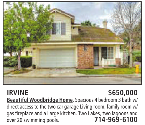 IRVINE $650,000 BeautifulWoodbridge Home.Spacious 4bedroom3bathw/ direct access to thetwo cargarageLiving room,familyroomw/ gasfireplaceand aLarge kitchen. TwoLakes,two lagoons and over20swimmingpools. 714-969-6100