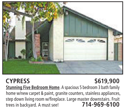 CYPRESS $619,900 StunningFiveBedroom Home.Aspacious 5bedroom3bathfamily homew/new carpet &paint, granite counters, stainlessappliances, stepdownliving room w/fireplace.Large masterdownstairs. Fruit treesinbackyard. Amustsee! 714-969-6100