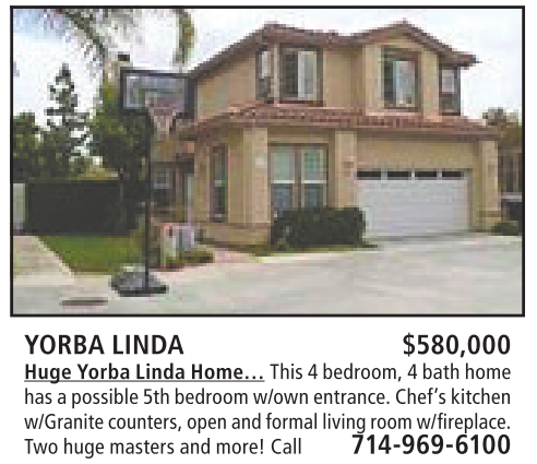 YORBA LINDA $580,000 Huge YorbaLinda Home… This 4bedroom,4bathhome hasapossible 5thbedroom w/ownentrance.Chef’s kitchen w/Granitecounters,openand formal living room w/fireplace. Twohugemasters andmore!Call 714-969-6100