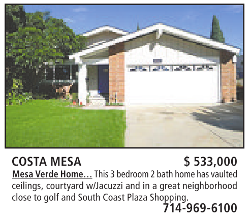 COSTA MESA $ 533,000 Mesa Verde Home… This 3bedroom2bathhome hasvaulted ceilings, courtyard w/Jacuzzi and in agreat neighborhood close to golf andSouth CoastPlaza Shopping.