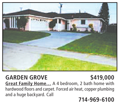 GARDEN GROVE $419,000 Great Family Home… A4bedroom, 2bath home with hardwood floors andcarpet. Forcedair heat,copperplumbing andahugebackyard. Call 714-969-6100