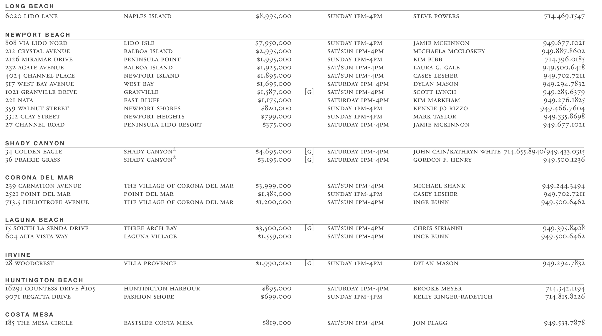NEWPORT BEACH 808 via lido nord lido isle $7,950,000 sunday 1pm-4pm jamie mckinnon 949.677.1021 212 crystal avenue balboa island $2,995,000 sat/sun 1pm-4pm michaela mccloskey 949.887.8602 2126 miramar drive peninsula point $1,995,000 sunday 1pm-4pm kim bibb 714.396.0185 232 agate avenue balboa island $1,925,000 sat/sun 1pm-4pm laura g. gale 949.500.6418 4024 channel place newport island $1,895,000 sat/sun 1pm-4pm casey lesher 949.702.7211 517 west bay avenue west bay $1,695,000 saturday 1pm-4pm dylan mason 949.294.7832 1021 granville drive granville $1,587,000 [g] sat/sun 1pm-4pm scott lynch 949.285.6379 221 nata east bluff $1,175,000 saturday 1pm-4pm kim markham 949.276.1825 359 walnut street newport shores $820,000 sunday 1pm-4pm kennie jo rizzo 949.466.7604 3312 clay street newport heights $799,000 sunday 1pm-4pm mark taylor 949.335.8698 27 channel road peninsula lido resort $375,000 saturday 1pm-4pm jamie mckinnon 949.677.1021