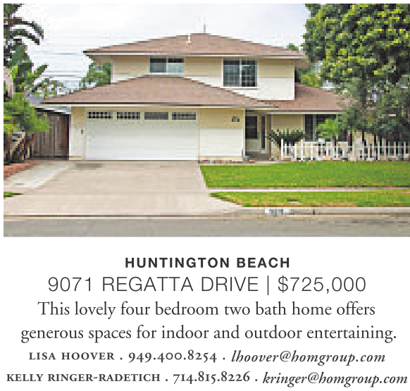 HUNTINGTON BEACH 9071 REGATTA DRIVE | $725,000 This lovely four bedroom two bath home offers generous spaces for indoor and outdoor entertaining. lisa hoover . 949.400.8254 . lhoover@homgroup.com kelly ringer-radetich . 714.815.8226 . kringer@homgroup.com