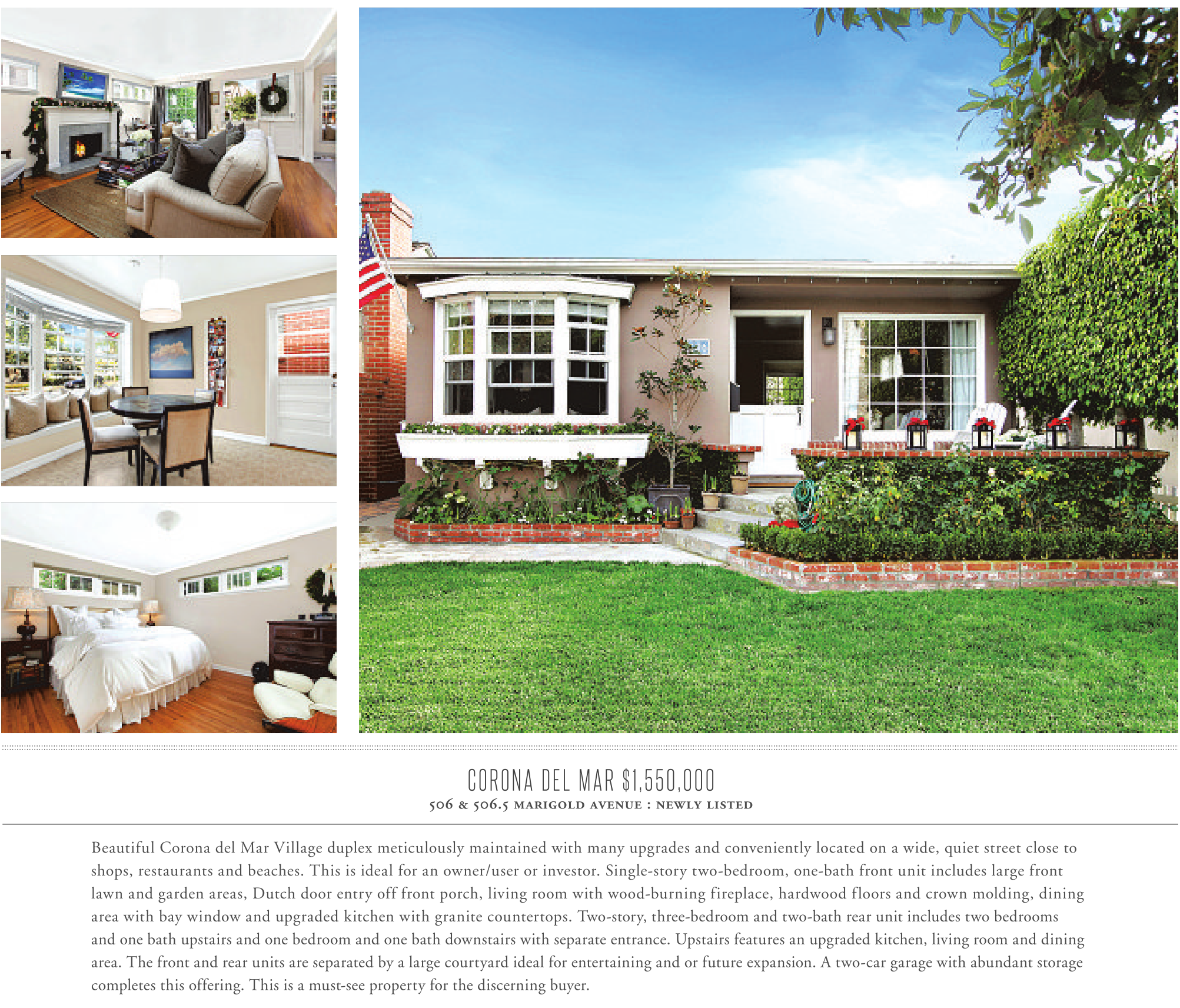 Beautiful Corona del Mar Village duplex meticulously maintained with many upgrades and conveniently located on a wide, quiet street close to shops, restaurants and beaches. This is ideal for an owner/user or investor. Single-story two-bedroom, one-bath front unit includes large front lawn and garden areas, Dutch door entry off front porch, living room with wood-burning fireplace, hardwood floors and crown molding, dining area with bay window and upgraded kitchen with granite countertops. Two-story, three-bedroom and two-bath rear unit includes two bedrooms and one bath upstairs and one bedroom and one bath downstairs with separate entrance. Upstairs features an upgraded kitchen, living room and dining area. The front and rear units are separated by a large courtyard ideal for entertaining and or future expansion. A two-car garage with abundant storage completes this offering. This is a must-see property for the discerning buyer.