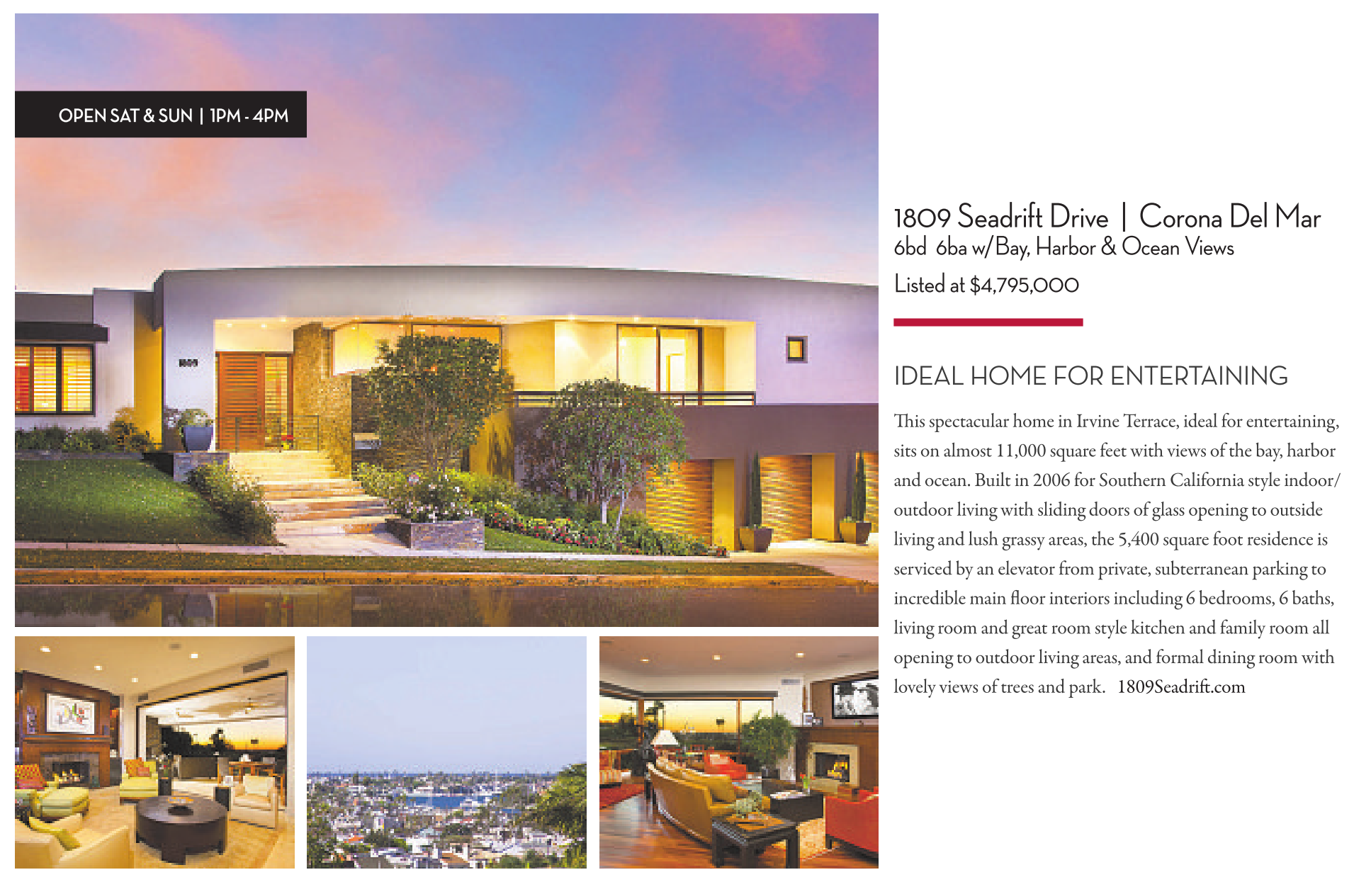 Thisspectacular home in Irvine Terrace, idealfor entertaining, sitsonalmost11,000 squarefeetwithviews of thebay,harbor and ocean.Built in 2006 for Southern Californiastyle indoor/ outdoor livingwithsliding doors of glassopening to outside livingand lush grassy areas, the5,400 squarefootresidence is servicedbyanelevator from private, subterranean parking to incredible main floor interiors including 6bedrooms, 6baths, living room and greatroomstyle kitchenand family room all opening to outdoor living areas, and formaldining room with lovely viewsoftrees and park. 1809Seadrift.com