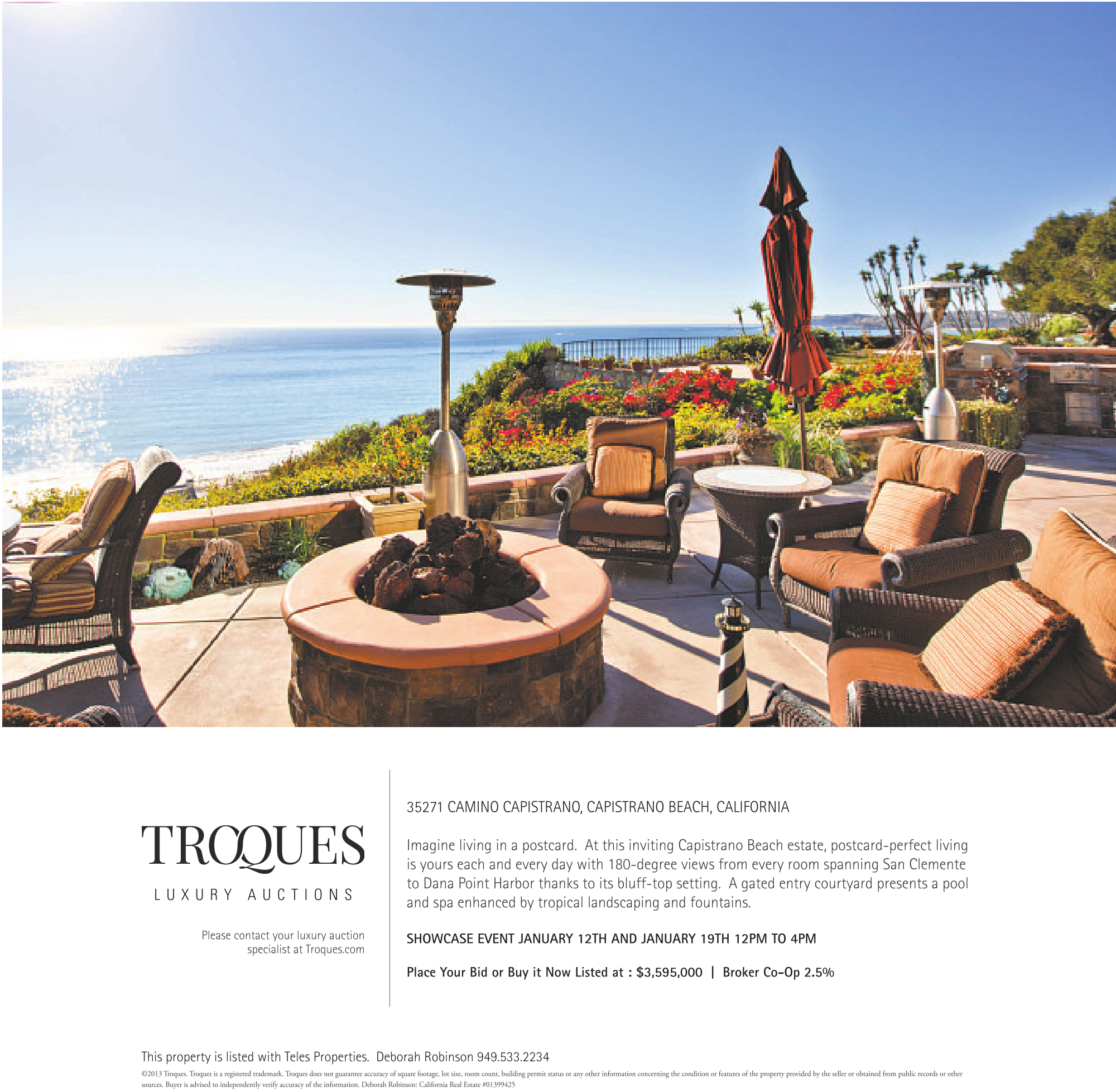 L U X U R Y A U C T I O N S 35271 CAMINO CAPISTRANO, CAPISTRANO BEACH, CALIFORNIA Imagine living in a postcard. At this inviting Capistrano Beach estate, postcard-perfect living is yours each and every day with 180-degree views from every room spanning San Clemente to Dana Point Harbor thanks to its bluff-top setting. A gated entry courtyard presents a pool and spa enhanced by tropical landscaping and fountains. Please contact your luxury auction specialist at Troques.com SHOWCASE EVENT JANUARY 12TH AND JANUARY 19TH 12PM TO 4PM Place Your Bid or Buy it Now Listed at : $3,595,000 | Broker Co-Op 2.5% This property is listed with Teles Properties. Deborah Robinson 949.533.2234 ©2013 Troques. Troques is aregistered trademark. Troques does not guarantee accuracy of squarefootage, lot size, room count, building permit status or any other information concerning the condition or features of the property provided by the seller or obtained from public records or other sources. Buyerisadvised to independently verify accuracy of the information. Deborah Robinson: California Real Estate #01399425
