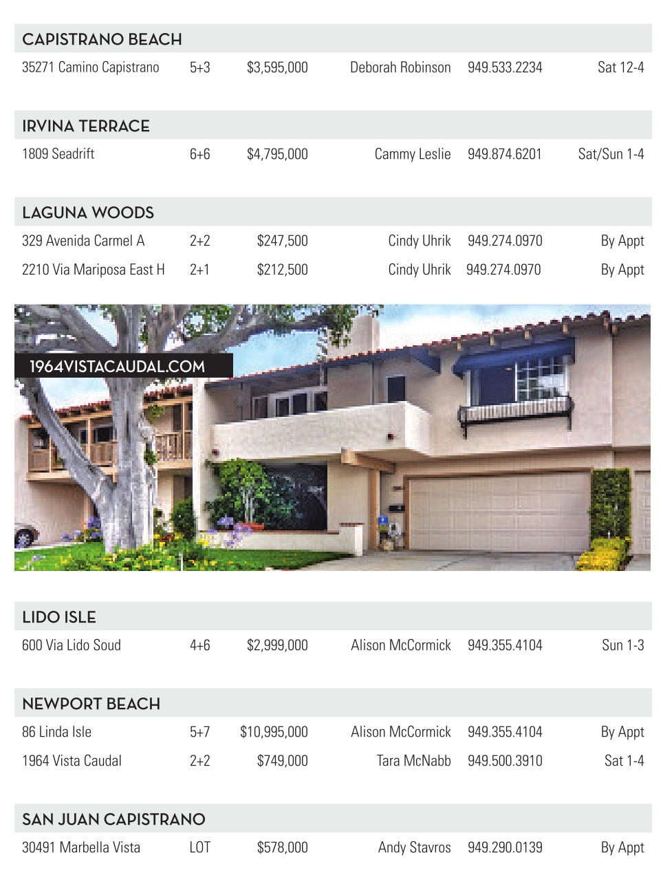 Capistrano BeaCh 35271 Camino Capistrano 5+3 $3,595,000 Deborah Robinson 949.533.2234 Sat 12-4 irvina terraCe 1809 Seadrift 6+6 $4,795,000 Cammy Leslie 949.874.6201 Sat/Sun 1-4 Laguna Woods 329 Avenida Carmel A 2+2 $247,500 Cindy Uhrik 949.274.0970 By Appt 2210 ViaMariposa East H 2+1 $212,500 Cindy Uhrik 949.274.0970 By Appt 1964vistacaudal.com Lido isLe 600 ViaLido Soud 4+6 $2,999,000 Alison McCormick 949.355.4104 Sun 1-3 neWportBeaCh 86 Linda Isle 5+7 $10,995,000 Alison McCormick 949.355.4104 By Appt 1964 Vista Caudal 2+2 $749,000 Tara McNabb 949.500.3910 Sat 1-4 sanjuanCapistrano 30491 Marbella Vista LOT $578,000 Andy Stavros 949.290.0139 By Appt