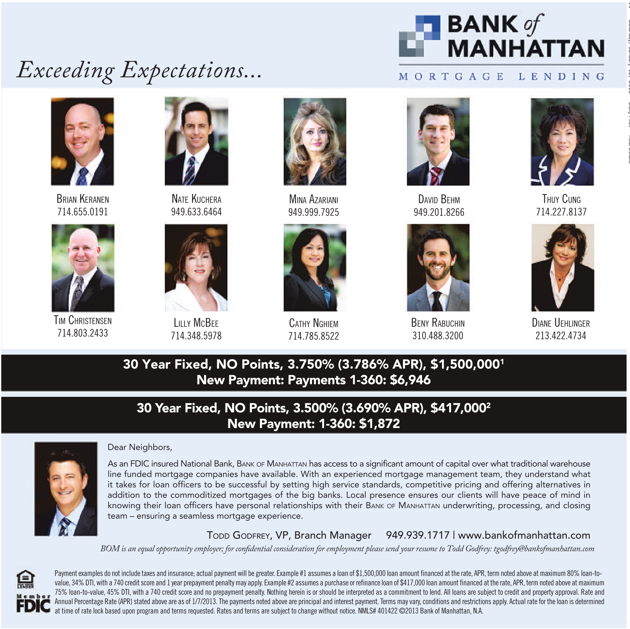 Payment examples do not include taxes and insurance; actual payment will be greater.Example #1 assumes aloan of $1,500,000 loan amount financed at the rate, APR, term noted above at maximum 80% loan-tovalue, 34% DTI, with a740 credit score and 1year prepayment penalty may apply.Example #2 assumes apurchase or refinance loan of $417,000 loan amount financed at the rate, APR, term noted above at maximum 75% loan-to-value, 45% DTI, with a740 credit score and no prepayment penalty.Nothing herein is or should be interpreted as acommitment to lend. All loans are subject to credit and property approval. Rate and Annual Percentage Rate (APR) stated above are as of 1/7/2013. The payments noted above are principal and interest payment. Terms may vary,conditions and restrictions apply.Actual rate for the loan is determined at time of rate lock based upon program and terms requested. Rates and terms are subject to change without notice. NMLS# 401422 ©2013 Bank of Manhattan, N.A.