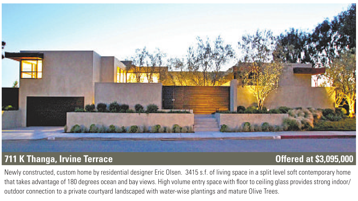 711 K Thanga, Irvine Terrace Offered at $3,095,000 Newly constructed, custom home by residential designer Eric Olsen. 3415 s.f. of living space in asplit level soft contemporary home that takes advantage of 180 degrees ocean and bay views. High volume entry space with floor to ceiling glass provides strong indoor/ outdoor connection to a private courtyard landscaped with water-wise plantings and mature Olive Trees.