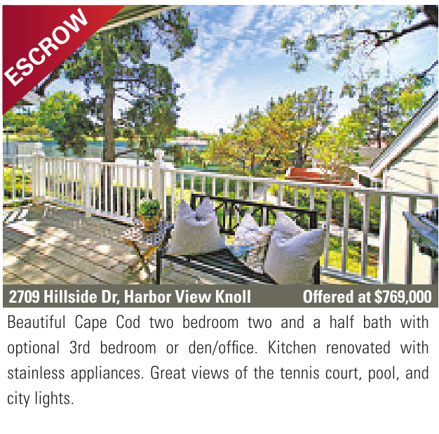 2709 Hillside Dr,Harbor View Knoll Offered at $769,000 Beautiful Cape Cod two bedroom two and a half bath with optional 3rd bedroom or den/office. Kitchen renovated with stainless appliances. Great views of the tennis court, pool, and city lights.