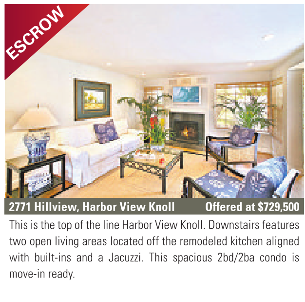 2771 Hillview, Harbor View Knoll Offered at $729,500 This is the top of the line Harbor View Knoll. Downstairs features two open living areas located off the remodeled kitchen aligned with built-ins and a Jacuzzi. This spacious 2bd/2ba condo is move-in ready.