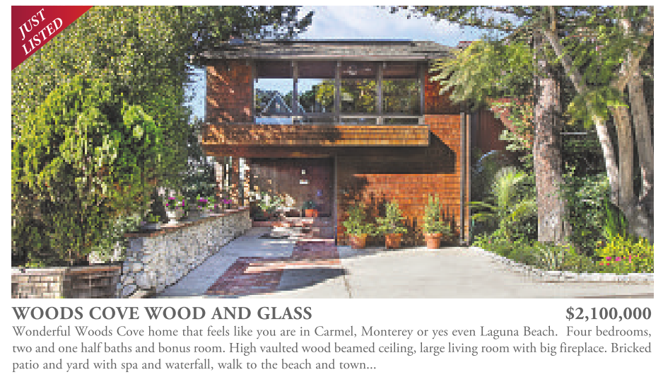 WOODS COVE WOOD AND GLASS $2,100,000 Wonderful Woods Cove home that feels like you are in Carmel, Monterey or yes even Laguna Beach. Four bedrooms, two and one half baths and bonus room. High vaulted wood beamed ceiling, large living room with big fireplace. Bricked patio and yard with spa and waterfall, walk to the beach and town...