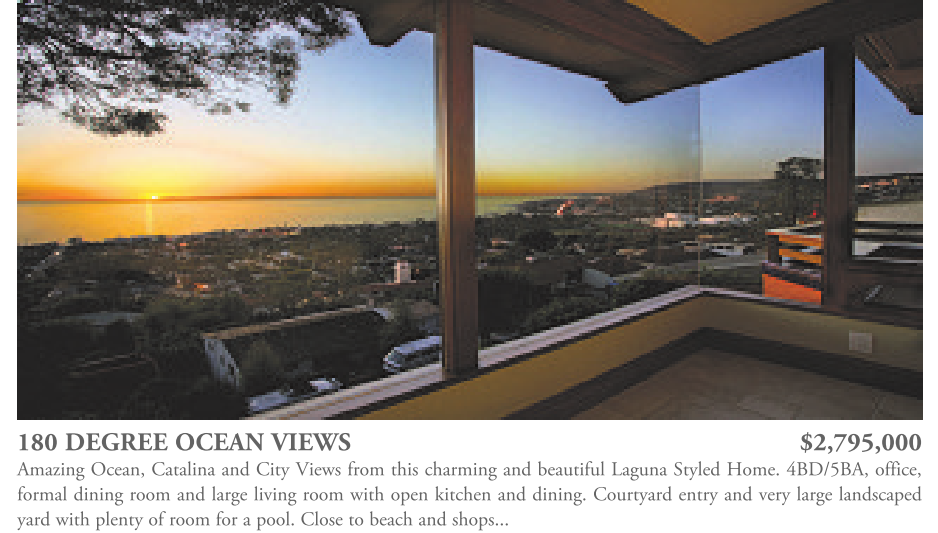Amazing Ocean, Catalina and City Views from this charming and beautiful Laguna Styled Home. 4BD/5BA, office, formal dining room and large living room with open kitchen and dining. Courtyard entry and very large landscaped yard with plenty of room for apool. Close to beach and shops...
