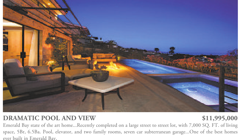 DRAMATIC POOL AND VIEW $11,995,000 Emerald Bay state of the art home...Recently completed on alarge street to street lot, with 7,000 SQ. FT. of living space, 5Br, 6.5Ba. Pool, elevator, and two family rooms, seven car subterranean garage...One of the best homes ever built in Emerald Bay.