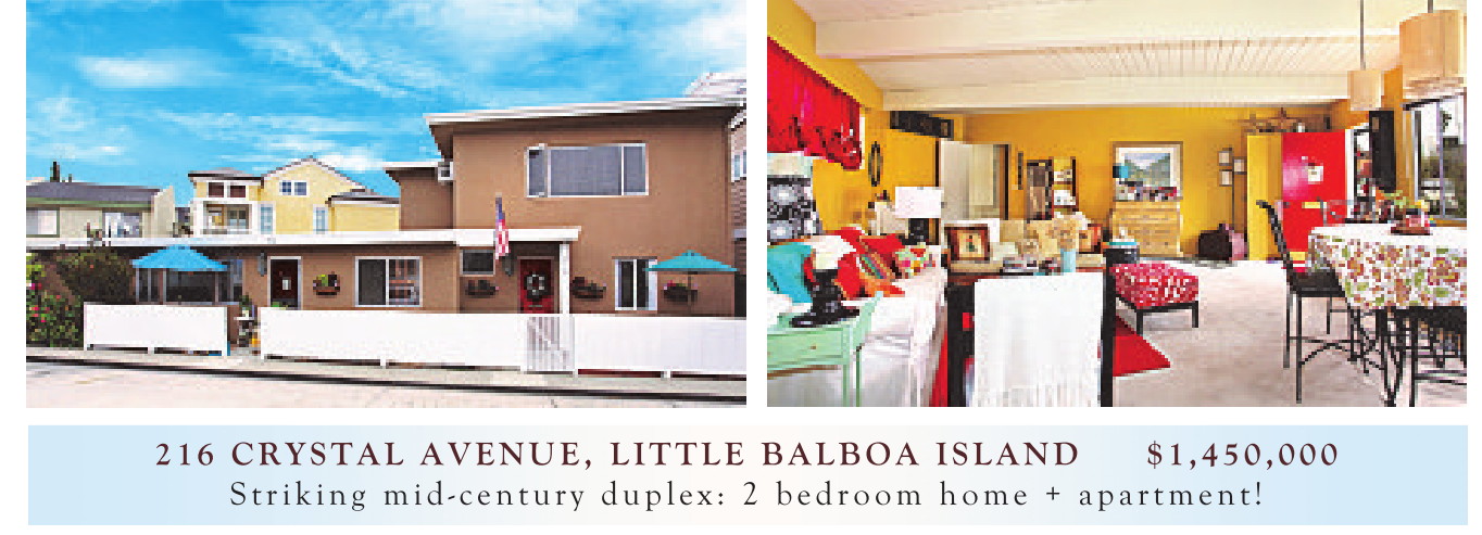 216 CRYSTAL AVENUE, LITTLE BALBOA ISLAND $1,450,000 Striking mid-century duplex: 2 bedroom home + apartment!