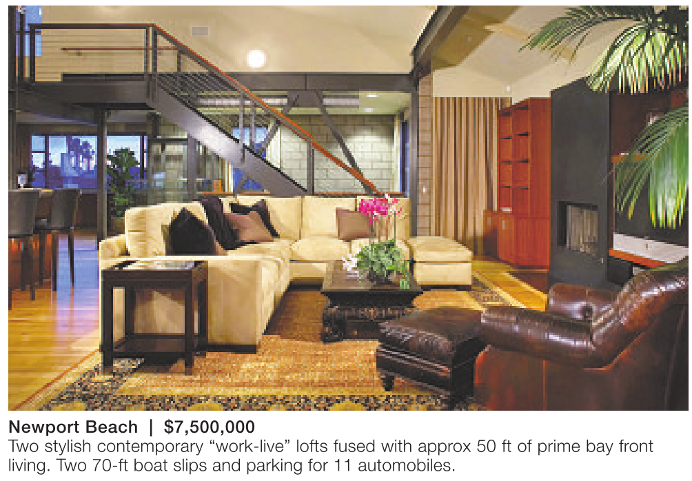 Newport Beach | $7,500,000 Two stylish contemporary “work-live” lofts fused with approx 50 ft of prime bay front living. Two 70-ft boat slips and parking for 11 automobiles.