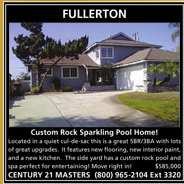FULLERTON Custom Rock Sparkling Pool Home! Located inaquiet cul-de-sac this isagreat 5BR/3BA with lots of greatupgrades. It features newflooring, newinteriorpaint, and anew kitchen. The side yard has acustom rock pool and spa perfect for entertaining! Move right in! $585,000 CENTURY 21 MASTERS (800) 965-2104 Ext 3320 See also