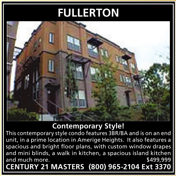 FULLERTON Contemporary Style! This contemporary stylecondofeatures3BR/BAand is on an end unit,inaprimelocation in AmerigeHeights. It also features aspacious and bright floor plans, with custom window drapes and mini blinds, a walk in kitchen, a spacious island kitchen and much more. $499,999 CENTURY 21 MASTERS (800) 965-2104 Ext 3370 See also