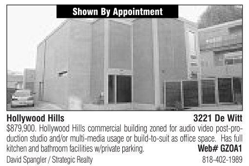 duction studio and/or multi-media usage or build-to-suit as office space. Has full $879,900. Hollywood Hills commercial building zoned for audio video post-pro- kitchen and bathroom facilities w/private parking. Web# GZOA1