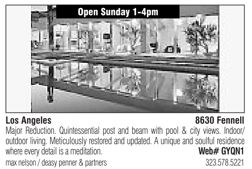Open Sunday 1-4pm LosAngeles 8630 Fennell Major Reduction. Quintessential post and beam with pool & city views. Indoor/ outdoor living. Meticulously restored and updated. Aunique and soulful residence whereevery detail is ameditation. Web# GYQN1 max nelson /deasy penner &partners 323.578.5221