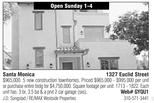 Open Sunday 1-4 Santa Monica 1327 Euclid Street $965,000. 5new construction townhomes. Priced $965,000 -$995,000 per unit or purchase entirebldg for $4,750,000. Squarefootage per unit: 1713 -1822. Each unit has: 3br, 3.5 ba &aprvt 2car garage (sxs). Web# GYQU1 J.D. Songstad /RE/MAX Westside Properties 310-571-3441