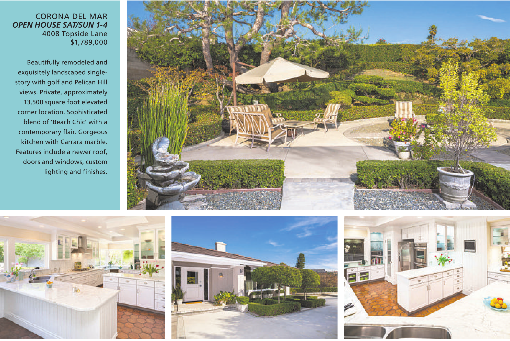 CORONA DEL MAR OPEN HOUSE SAT/SUN 1-4 4008 Topside Lane $1,789,000 Beautifully remodeled and exquisitely landscaped singlestory with golf and Pelican Hill views. Private, approximately 13,500 square foot elevated corner location. Sophisticated blend of ‘Beach Chic’ with a contemporary flair. Gorgeous kitchen with Carrara marble. Features include a newer roof, doors and windows, custom lighting and finishes.