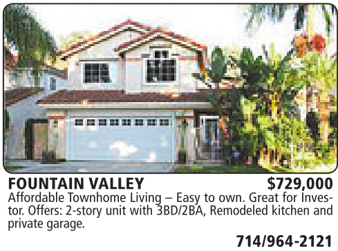 FOUNTAIN VALLEY $729,000 Affordable Townhome Living –Easy to own. Great for Investor.Offers: 2-story unit with 3BD/2BA, Remodeled kitchen and privategarage.