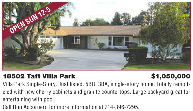18502 Taft Villa Park $1,050,000 Villa Park Single-Story. Just listed. 5BR, 3BA, single-story home. Totally remodeled with new cherry cabinets and granite countertops. Large backyard great for entertaining with pool. Call Ron Accornero formoreinformation at 714-396-7295.