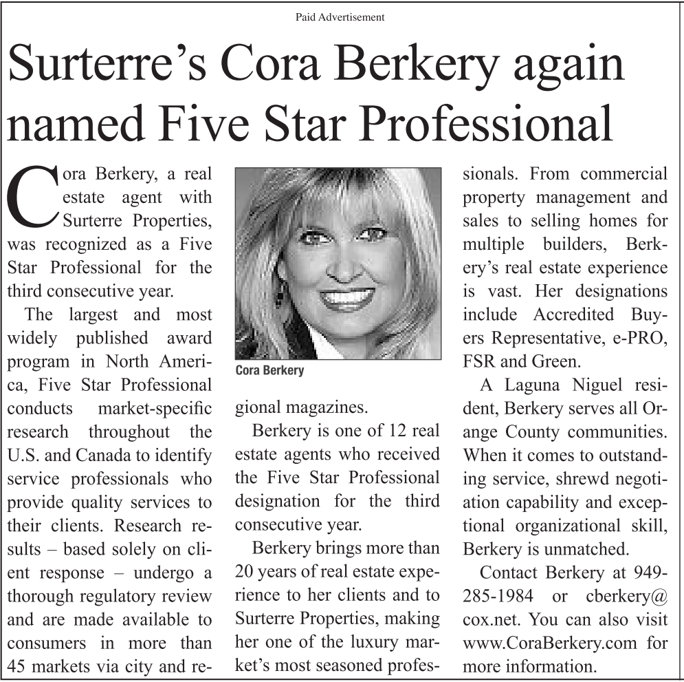 Berkery, a real estate agent with Surterre Properties, was recognized as a Five Star Professional for the third consecutive year.