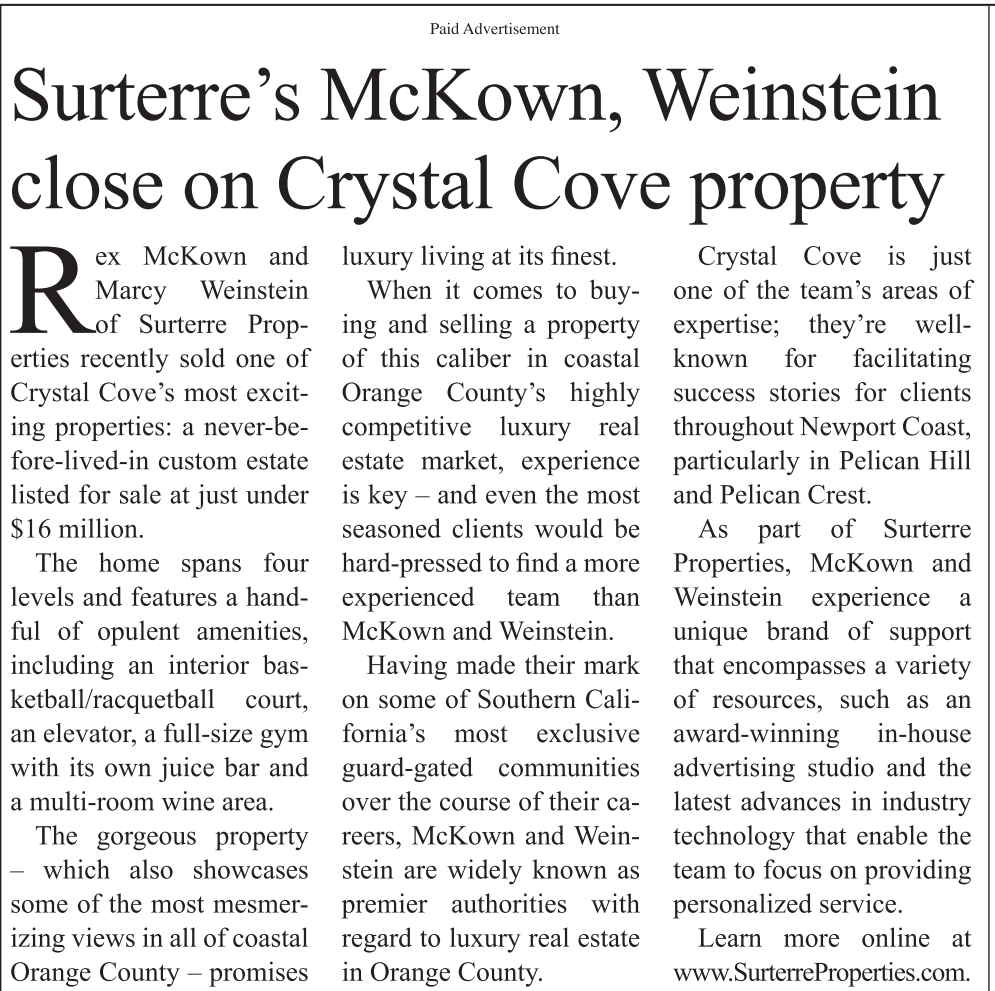 McKown and Marcy Weinstein of Surterre Properties recently sold one of Crystal Cove’s most exciting properties: a never-before-lived-in custom estate listed for sale at just under $16 million.