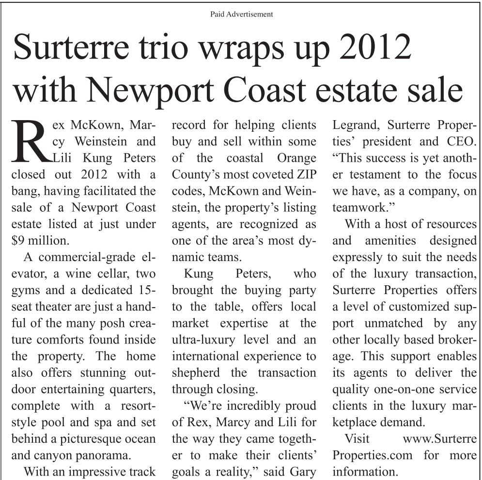 Surterre trio wraps up 2012 with Newport Coast estate sale