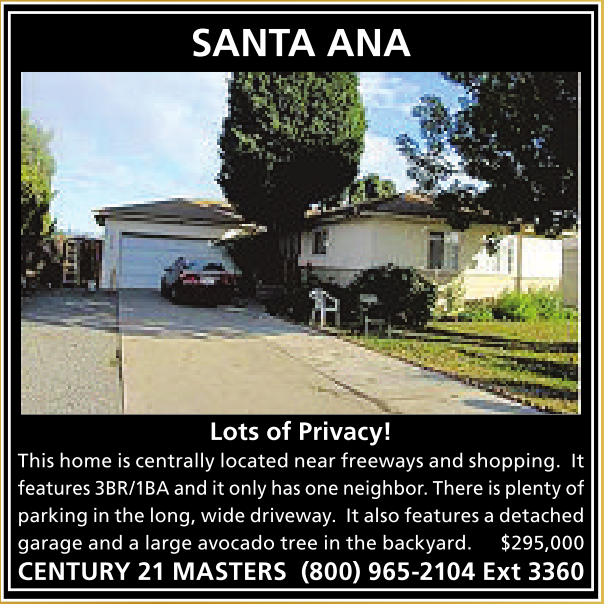 garage and alarge avocado tree inthe backyard. $295,000 CENTURY 21 MASTERS (800) 965-2104 Ext 3360