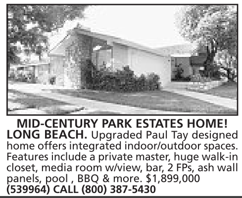 MID-CENTURY PARK ESTATES HOME! LONG BEACH. Upgraded Paul Tay designed home offers integrated indoor/outdoor spaces. Features includeaprivate master,huge walk-in closet, media room w/view,bar,2FPs, ash wall panels, pool , BBQ & more. $1,899,000 (539964) CALL (800) 387-5430