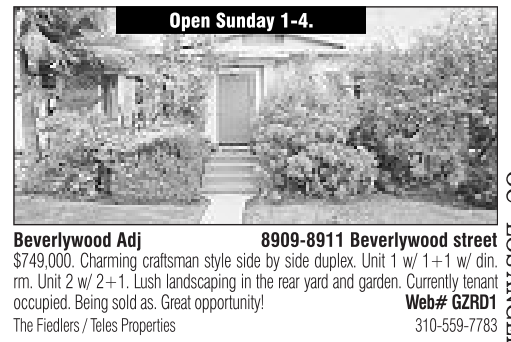 Beverlywood Adj Open Sunday 1-4. 8909-8911 Beverlywood street $749,000. Charming craftsman style side by side duplex. Unit 1w/1+1 w/ din. rm. Unit 2w/2+1. Lush landscaping in the rear yardand garden. Currently tenant occupied. Being sold as. Great opportunity! Web# GZRD1 The Fiedlers /Teles Properties 310-559-7783
