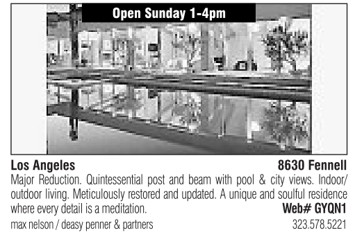 LosAngeles Open Sunday 1-4pm 8630 Fennell Major Reduction. Quintessential post and beam with pool & city views. Indoor/ outdoor living. Meticulously restored and updated. Aunique and soulful residence whereevery detail is ameditation. Web# GYQN1 max nelson /deasy penner &partners 323.578.5221 See also