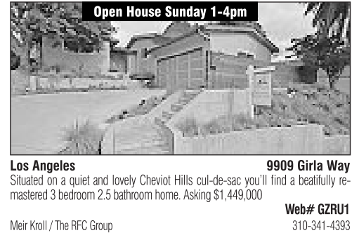 Situated on aquiet and lovely Cheviot Hills cul-de-sac you’ll find abeatifully remastered 3bedroom 2.5 bathroom home. Asking $1,449,000 Web# GZRU1 Meir Kroll /The RFC Group 310-341-4393
