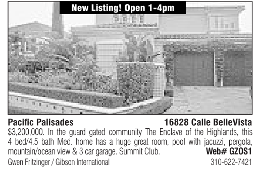 Pacific Palisades New Listing! Open 1-4pm 16828 Calle BelleVista $3,200,000. In the guard gated community The Enclave of the Highlands, this 4 bed/4.5 bath Med. home has a huge great room, pool with jacuzzi, pergola, mountain/ocean view &3car garage. Summit Club. Web# GZOS1 Gwen Fritzinger /Gibson International 310-622-7421